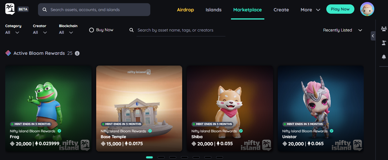 - Ganar Blooms: juega juegos y participa en misiones diarias dentro del juego para ganar Blooms, la moneda fuera de la cadena de Nifty Island. Cuanto más ganes, más puntos acumularás para tu elegibilidad para $ISLAND.